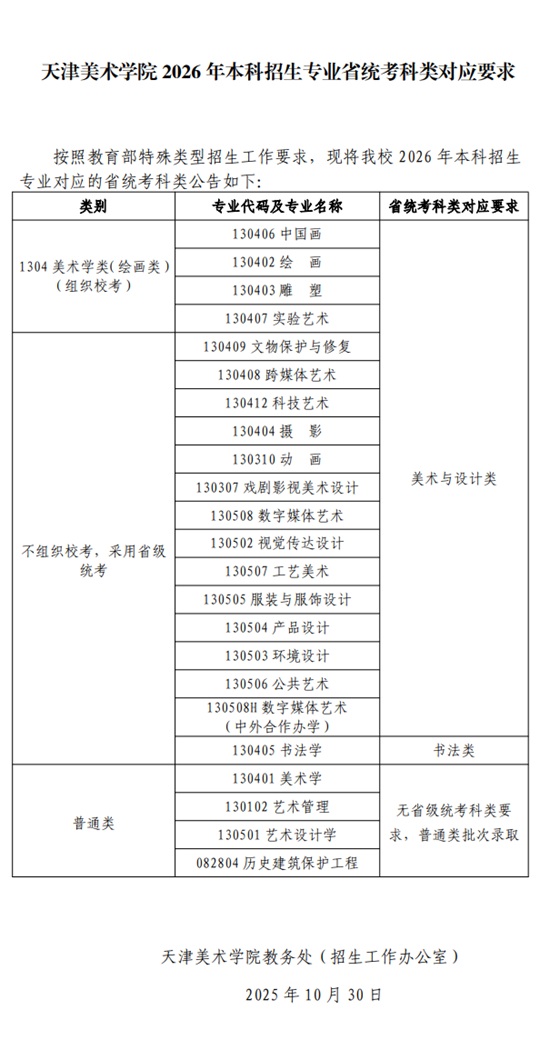天津美術(shù)學院2026年本科招生專業(yè)省統(tǒng)考科類對應(yīng)要求