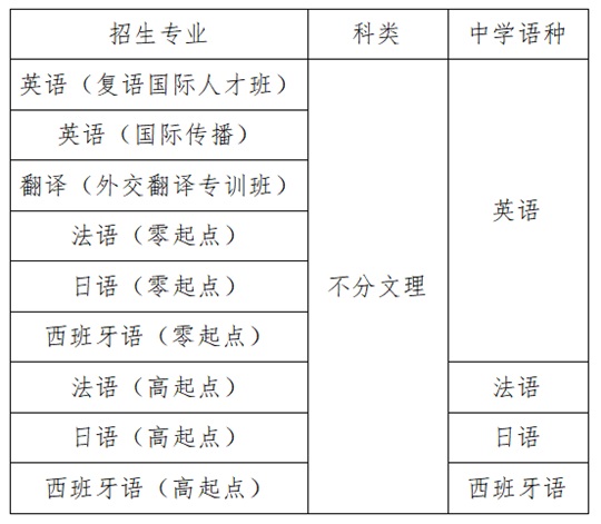 第六條 經(jīng)教育部批準(zhǔn)具有推薦保送生資格的外國(guó)語(yǔ)中學(xué)中具有保送生資格,符合當(dāng)年高考報(bào)名條件,身心健康,品學(xué)兼優(yōu),德智體美勞全面發(fā)展,有志于從事外交外事、翻譯、國(guó)際問(wèn)題研究、涉外法律、經(jīng)濟(jì)、文化交流和國(guó)際傳播工作的應(yīng)屆高中畢業(yè)生。