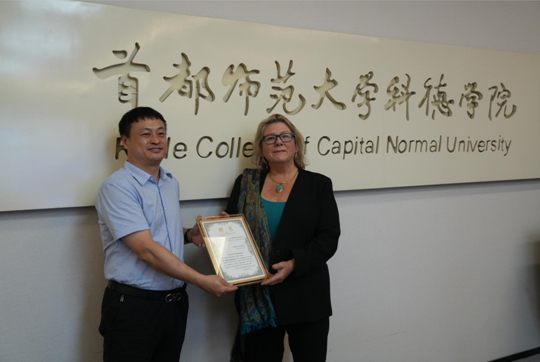 隨后,首都師范大學科德學院黨委書記兼常務副校長徐振劍為Carol Humphreys校長頒發(fā)國際導師聘書。