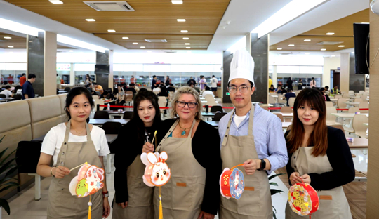 在校園餐廳,學校為遠道而來的Carol Humphreys校長一行安排了DIY手作月餅和制作中秋節(jié)花燈的活動。首都師范大學科德學院部分師生一同與索菲亞大學校長一行留下科德美食記憶。