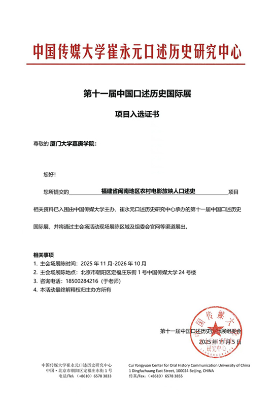 在京期間,廈門大學嘉庚學院師生團隊全程參與了中國口述歷史國際展的活動,通過觀摩來自不同國家和地區、涵蓋多元主題的優秀口述歷史項目,團隊成員深度理解口述歷史方法論在記錄歷史、保存記憶方面的巨大潛力與前沿發展。此外,師生團隊還前往中國電影博物館調研、采訪,館內關于“流動放映隊”的歷史展陳,加深了同學們對閩南農村放映人這段歷史的理解,也讓他們更加充分地認識到自身工作在國家電影文化宏大敘事中的定位與價值——即從微觀個體視角,補全與豐富中國電影歷史的脈絡。