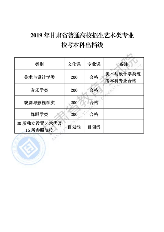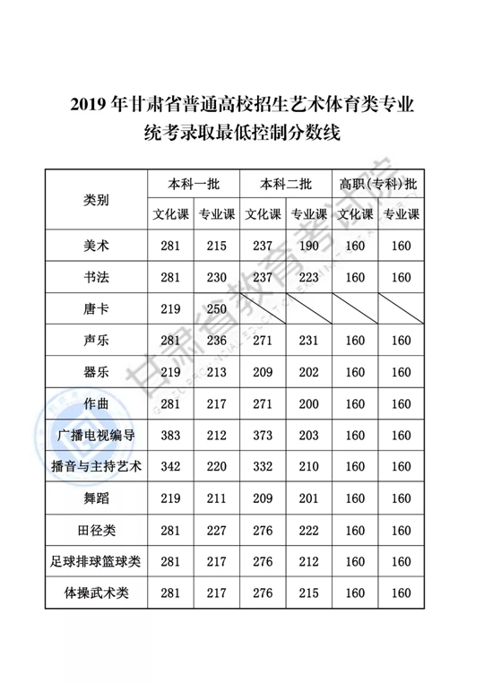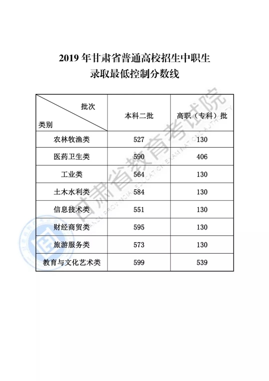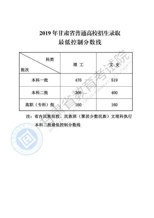 甘肅省2019年普通高校招生錄取最低控制分數線