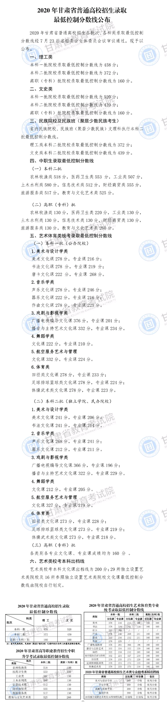 2020年甘肅省普通高校招生招生錄取最低控制分?jǐn)?shù)線