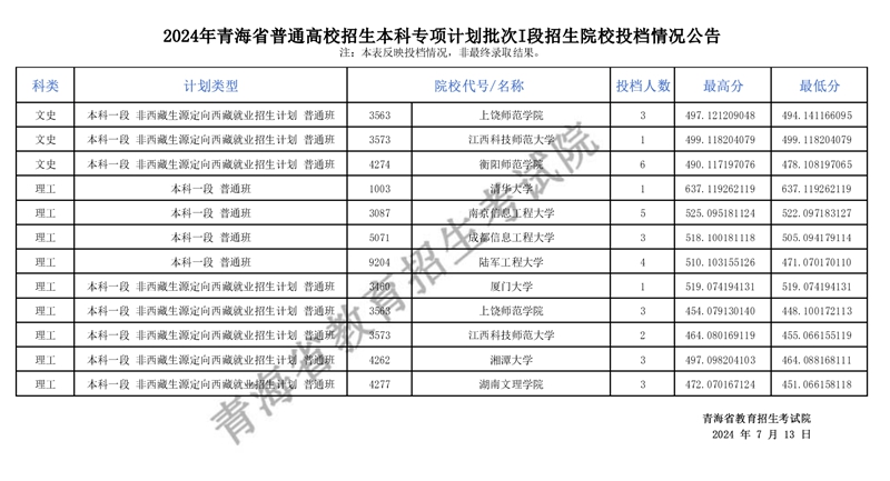 | 2024年青海省普通高校招生本科專項(xiàng)計(jì)劃批次I段招生院校投檔情況公告 |