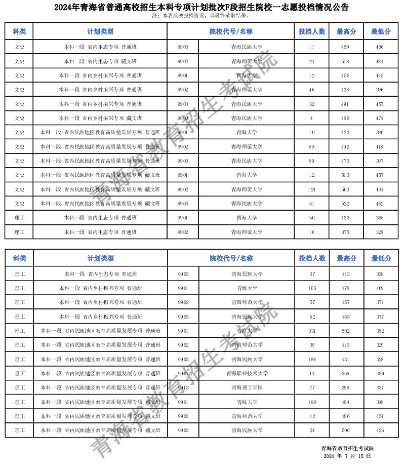 2024年青海省普通高校招生本科專項計劃批次F段招生院校一志愿投檔情況公告