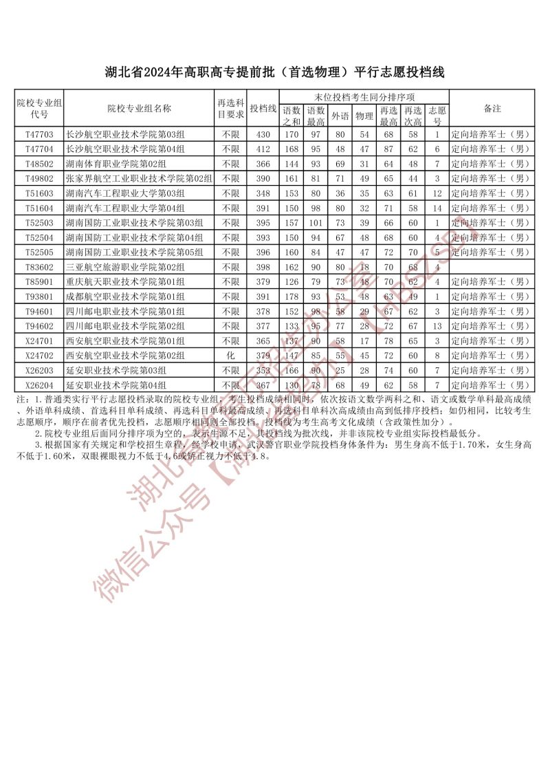 湖北省2024年高職高專提前批(首選物理)平行志愿投檔線