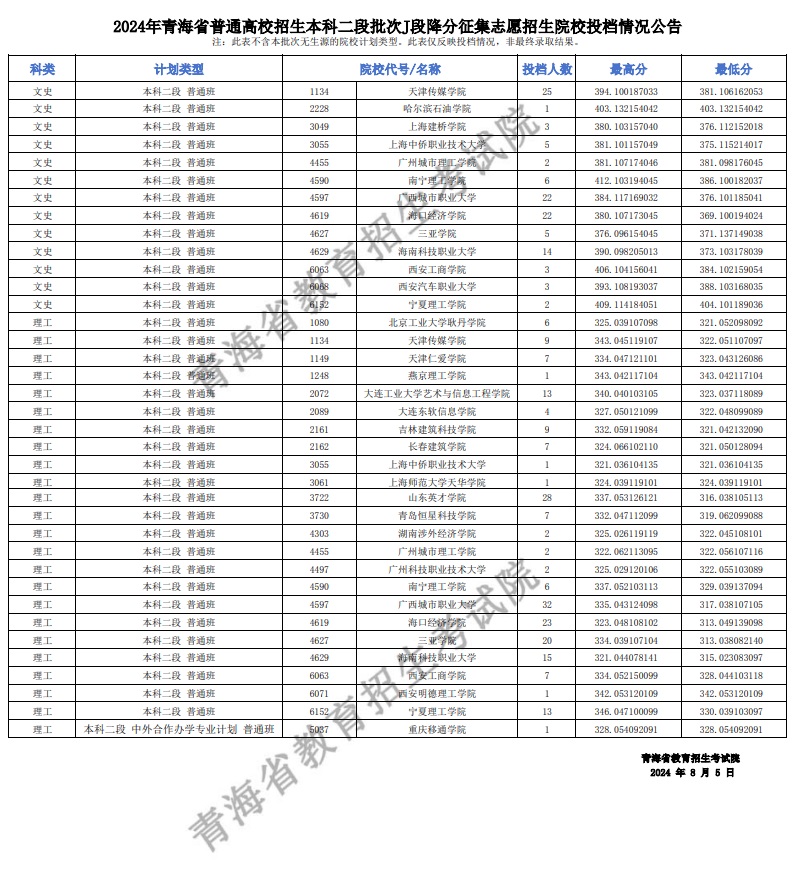 | 2024年青海省普通高校招生本科二段批次J段招生院校降分征集志愿投檔情況公告 |