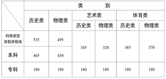 注:特殊類型錄取資格線用于強基計劃、高校專項計劃、軍隊院校招生等特殊類型招生。 |