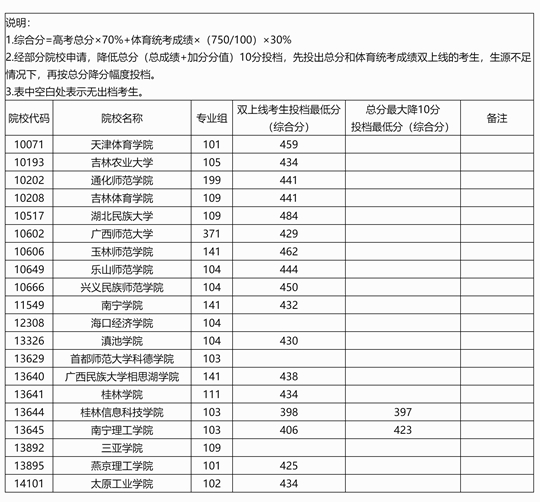 | 廣西:2025年本科提前批體育類院校專業(yè)組第一次征集投檔最低分?jǐn)?shù)線(首選歷史科目組) |