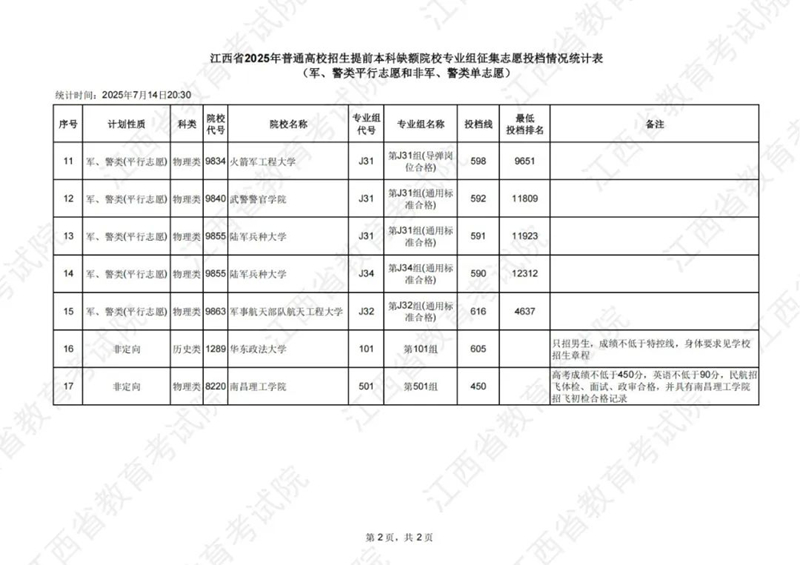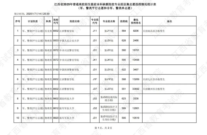 | 江西省2025年普通高校招生提前本科缺額院校專(zhuān)業(yè)組征集志愿投檔情況統(tǒng)計(jì)表(軍、警類(lèi)平行志愿和非軍、警類(lèi)單志愿) |