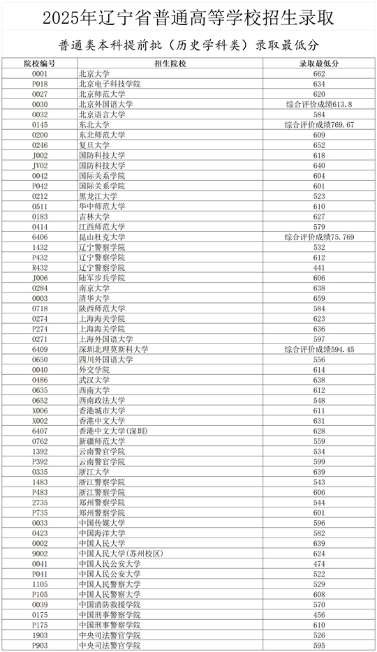 2025年遼寧省普通高等學校招生錄取普通類本科提前批(歷史學科類)錄取最低分(點擊查看)