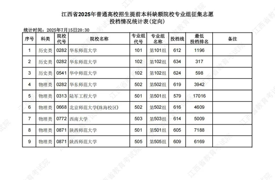 江西省2025年普通高校招生提前本科缺額院校專業組征集志愿投檔情況統計表(定向)