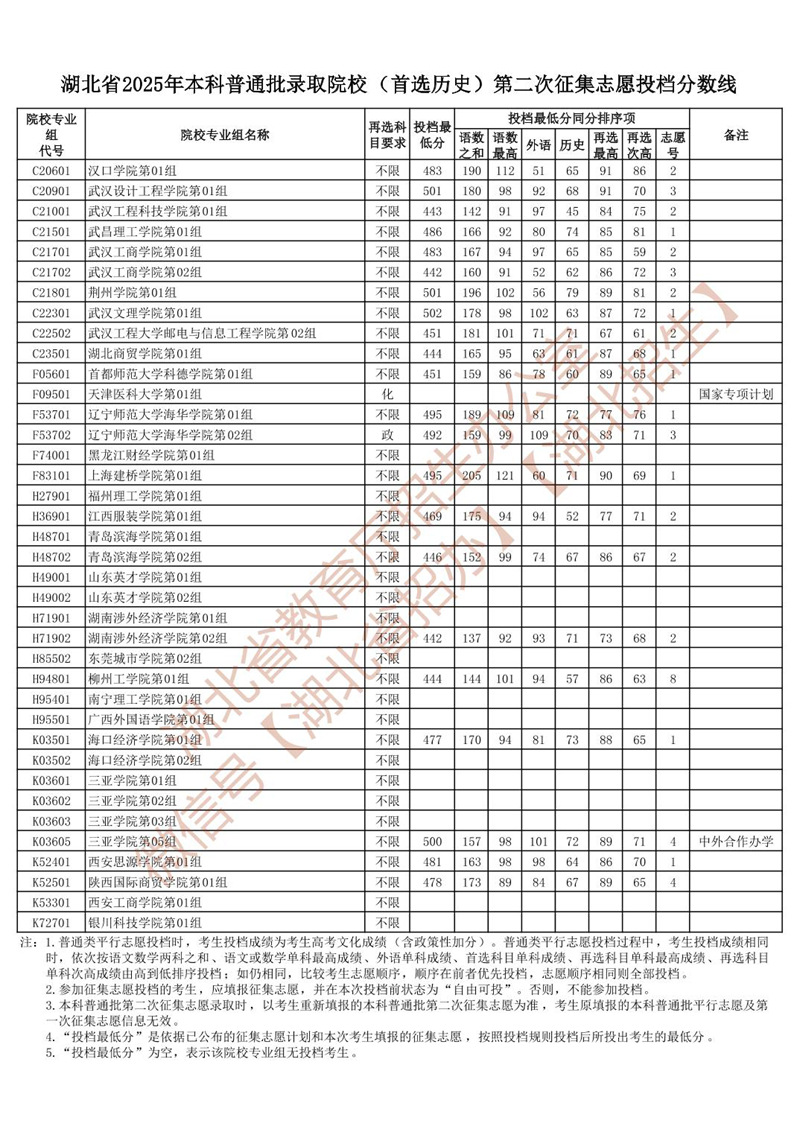 湖北省2025年本科普通批錄取院校 (首選歷史)第二次征集志愿投檔分數線