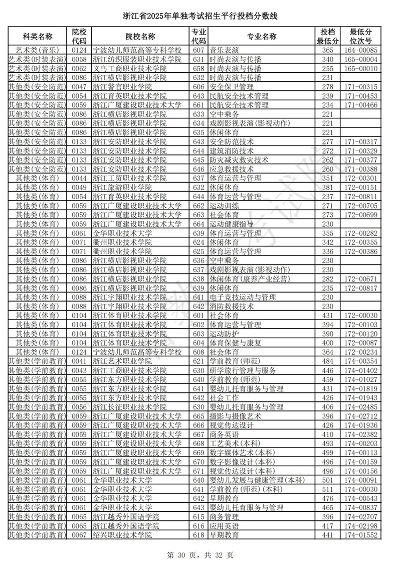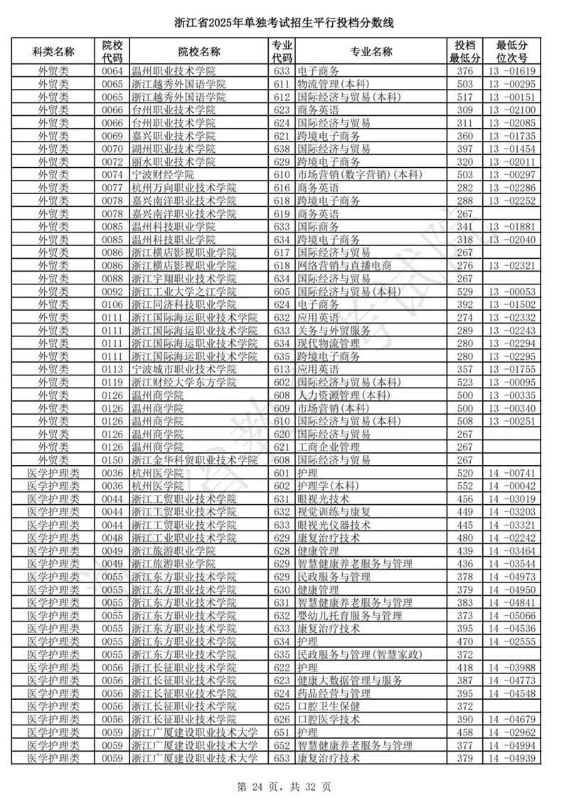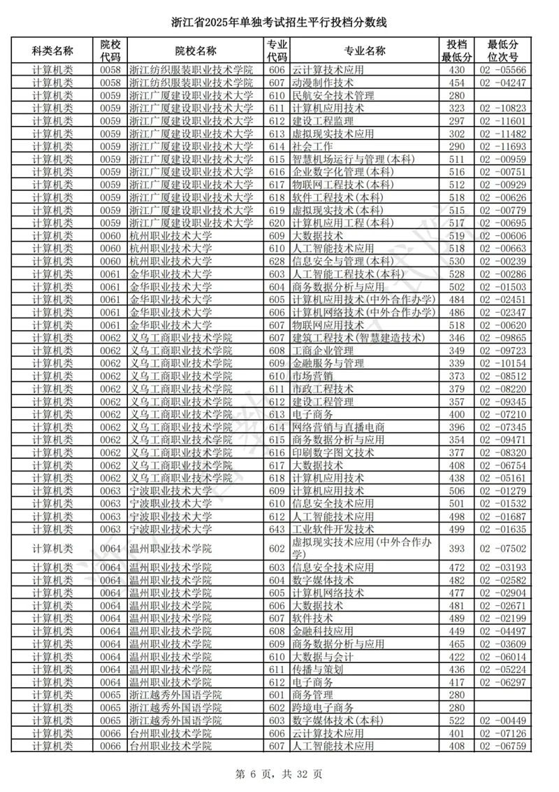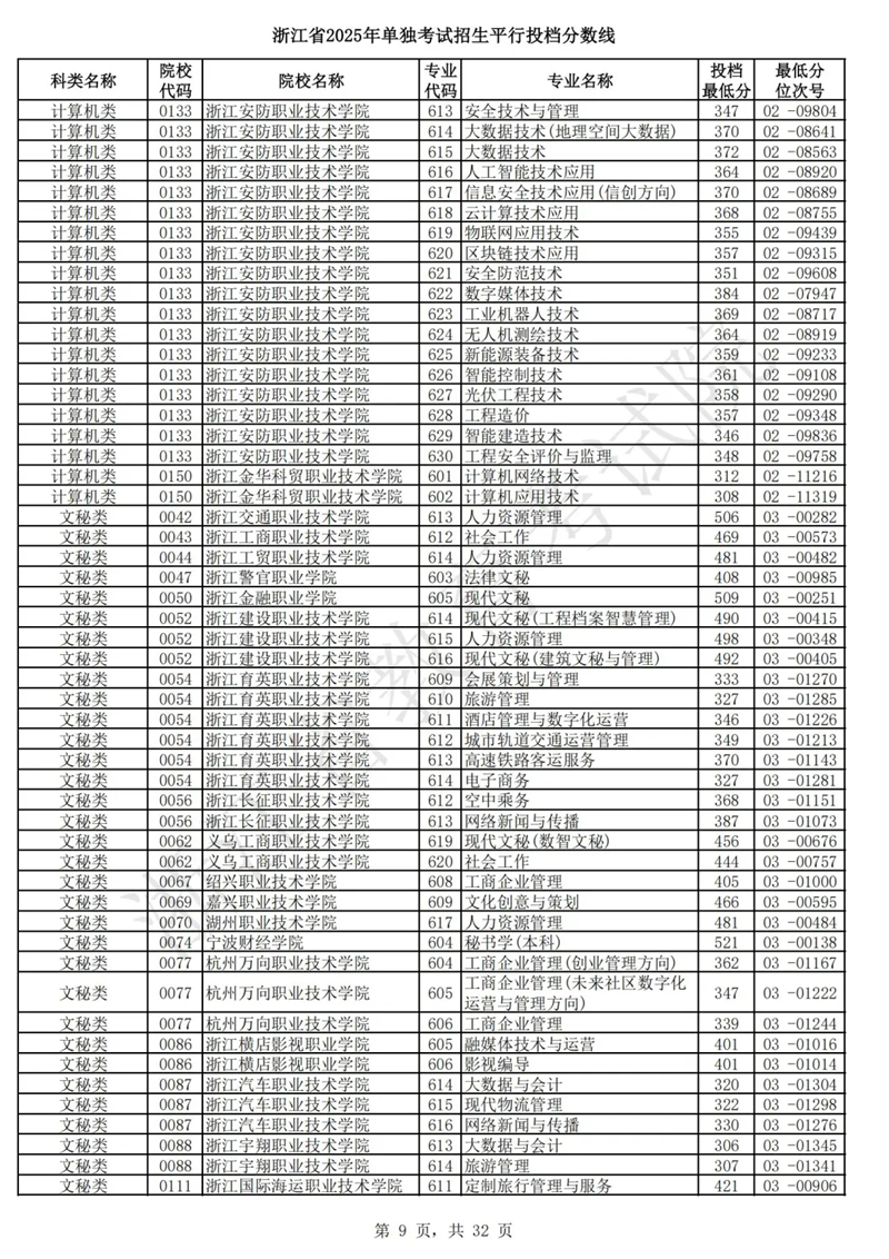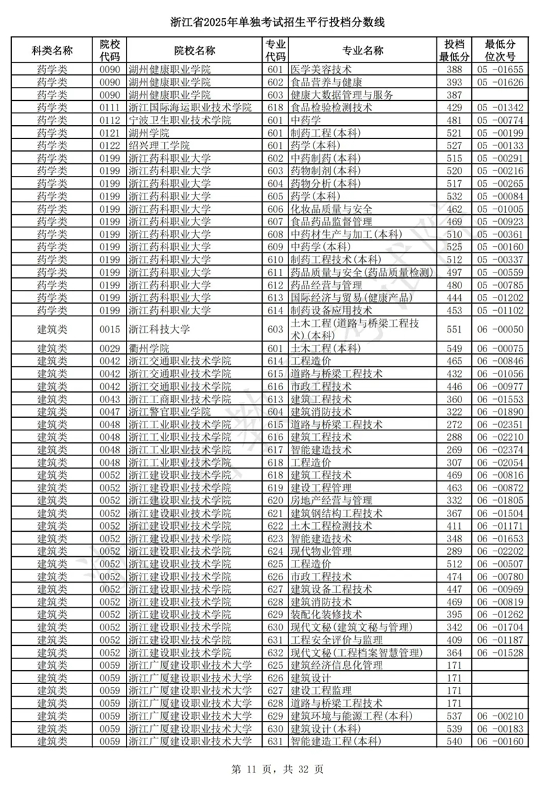 | 浙江省2025年單獨考試招生平行投檔分數線 |