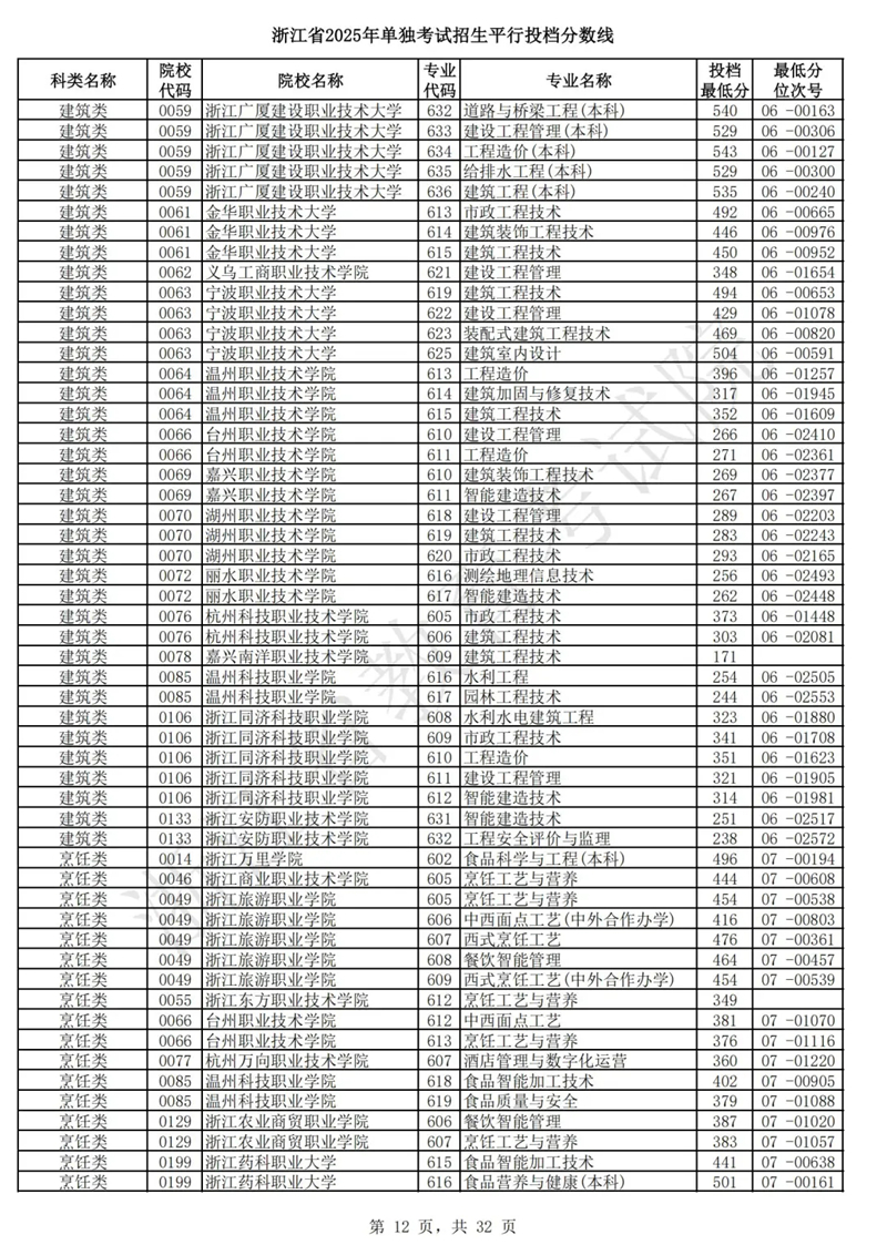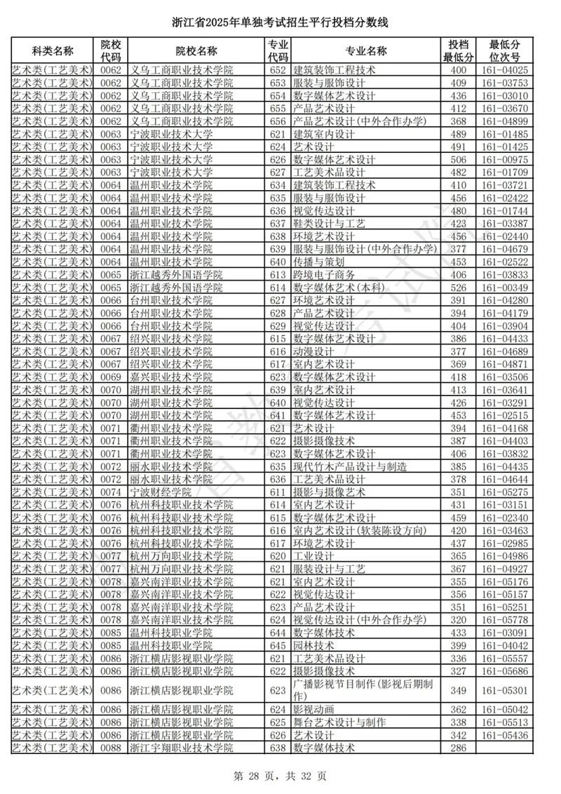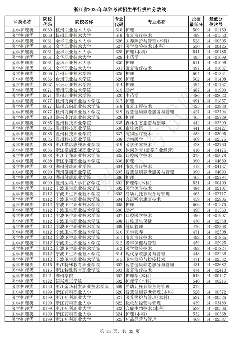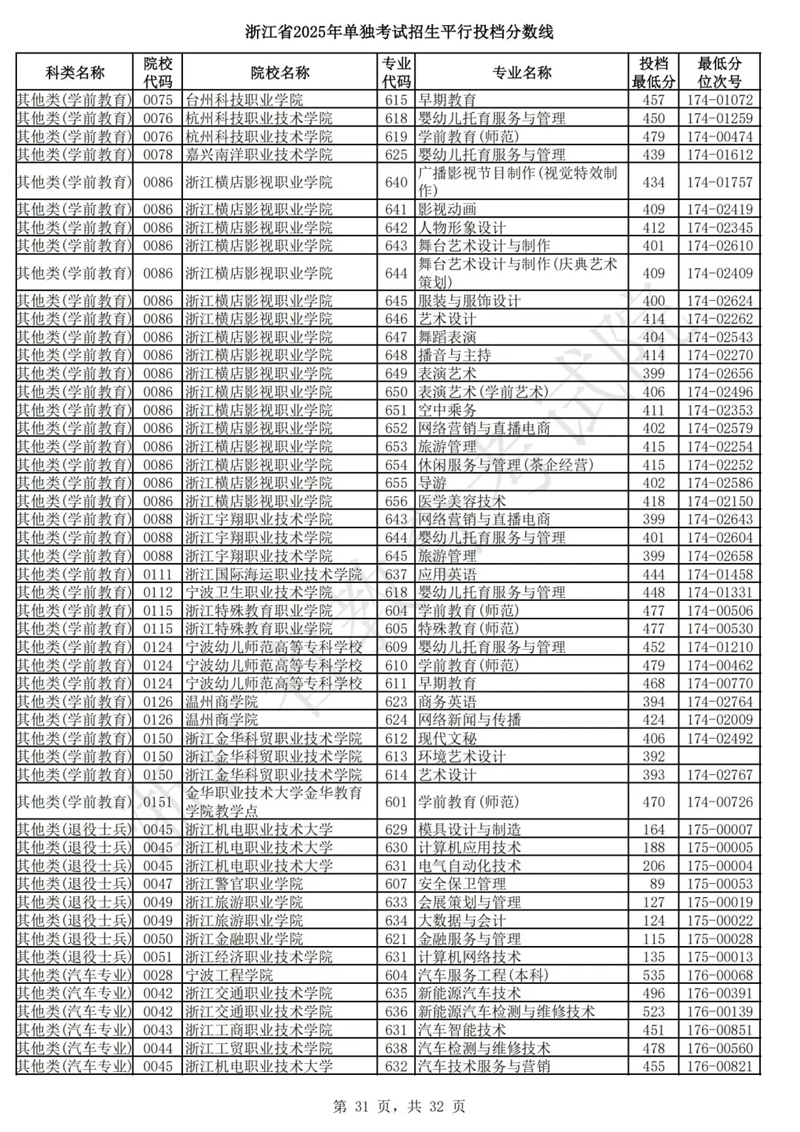 | 浙江省2025年單獨考試招生平行投檔分數線 |