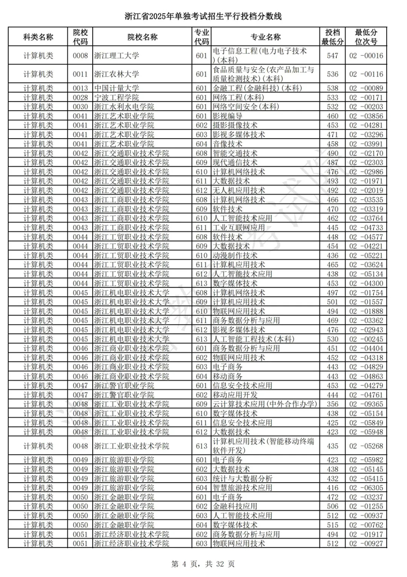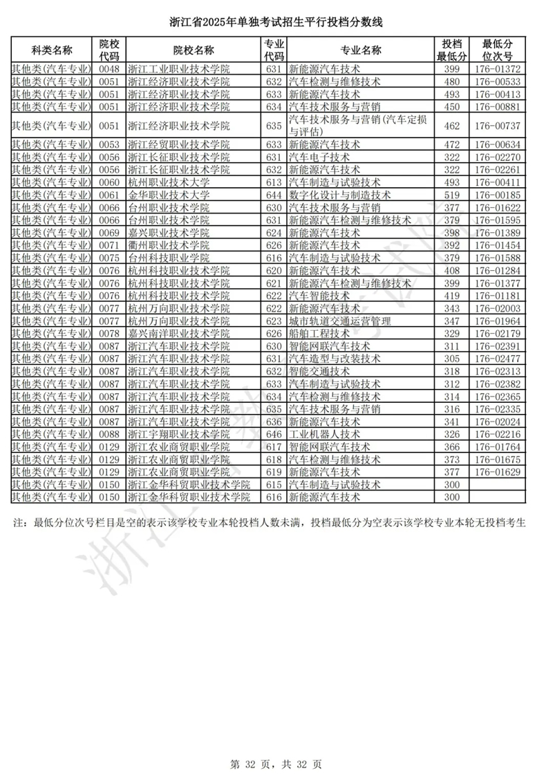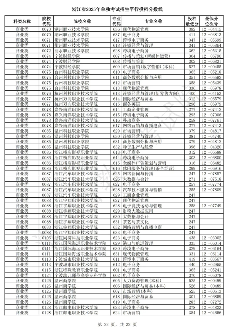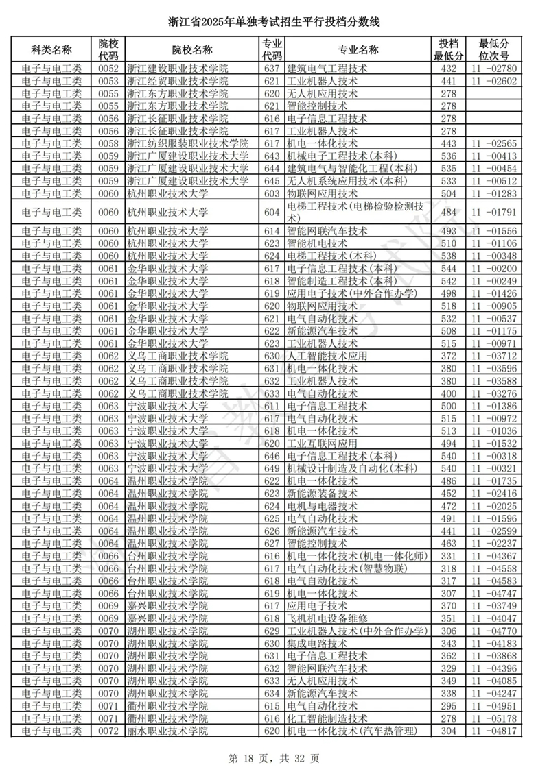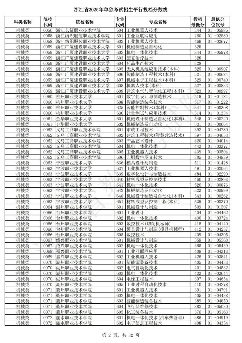 | 浙江省2025年單獨考試招生平行投檔分數線 |