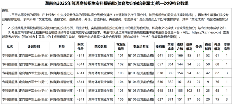 湖南省2025年普通高校招生專科提前批(體育類定向培養軍士)第一次投檔分數線