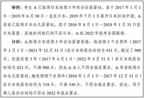 ①取得住在國長期或永久居留權,連續兩個自然年(即某年1月1日到次年12月31日)和報名前2年內(即2020年4月1日—2022年3月31日)在住在國實際累計居留均不少于540天。