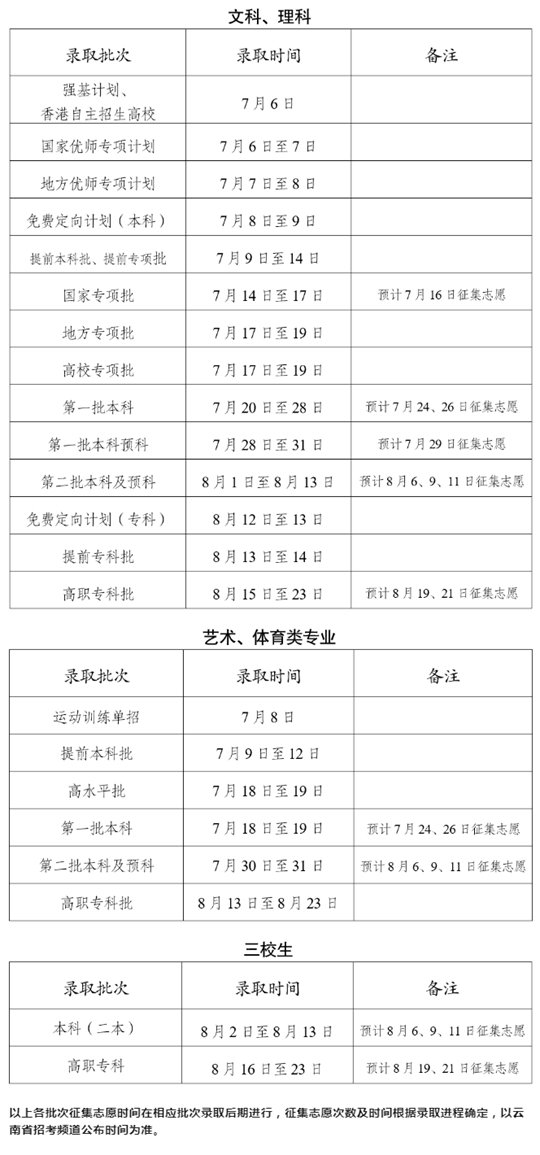 2023年云南省普通高校招生錄取時(shí)間進(jìn)度計(jì)劃