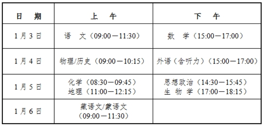 適應性測試時間為2025年1月3日至6日,具體科目及時間安排如下: