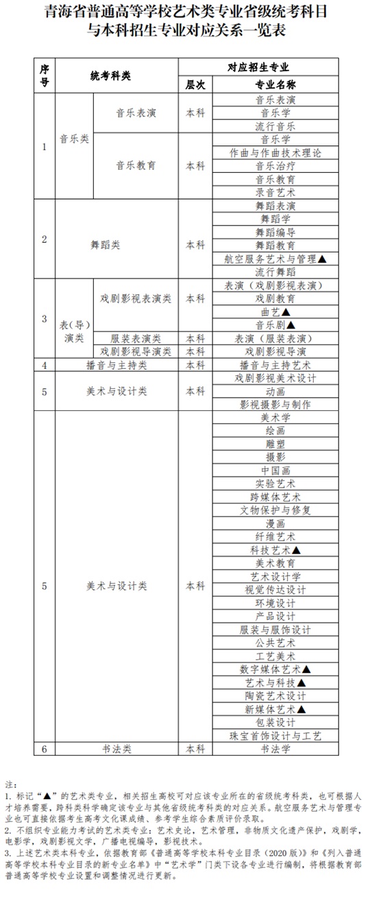 | 青海省普通高等學校藝術(shù)類專業(yè)省級統(tǒng)考科目與本科招生專業(yè)對應(yīng)關(guān)系一覽表 |