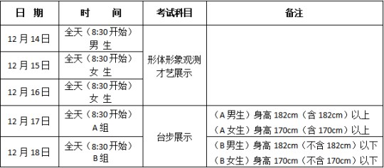 1、形體形象觀測、才藝展示:男生2024年12月14日考試,女生2024年12月15-16日考試。上午8:30考試,下午13:00考試,上午單元未考完,下午單元考試順延。檢錄時間為上午8:00-8:45,下午12:30-13:15,未按規定時間候考(或檢錄)的,視為放棄考試。【形體形象觀測(四樓402室),才藝展示(一樓101表演廳)】。
