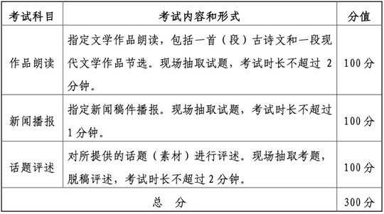 (5)考試:每位考生在一個面試考室一次性完成考試,包括作品朗讀、新聞播報、話題評述三個科目。三個科目均為現場抽取試題。
