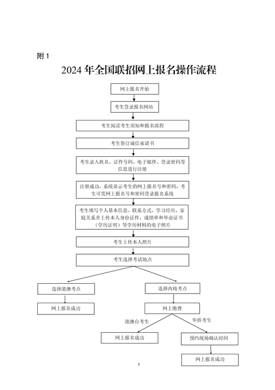 所有考生均須在上述規定時間內登錄系統,按要求進行注冊,輸入報考信息,上傳本人照片、身份證件及學歷資料電子照片,選擇考試地點。考試地點一旦提交,包括但不限于個人信息、考試地點等內容,均不得再進行修改。內地考點考生還須完成網上繳費,華僑考生須預約現場確認報名時間,逾期不再受理。網上報名成功后,報名狀態顯示為“待確認”。網上報名流程見附1。