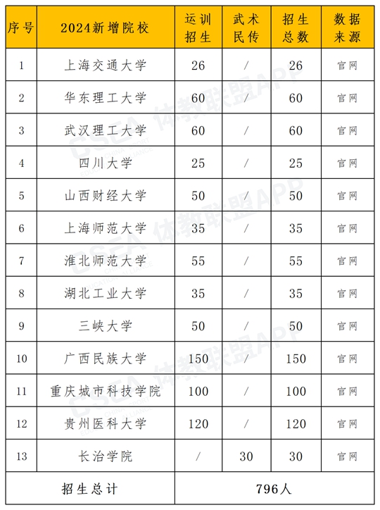 值得關(guān)注的是,2024年13所新增體育單招院校計劃招生總?cè)藬?shù)為796人。