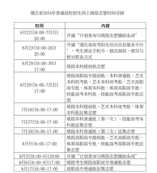 | 湖北省2024年普通高校招生網上填報志愿時間安排 |