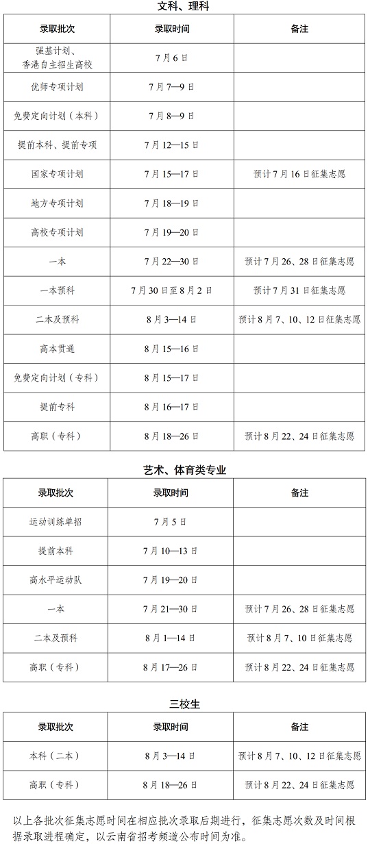 2024年云南省普通高校招生錄取時(shí)間進(jìn)度計(jì)劃