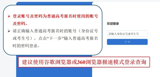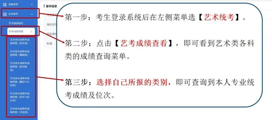 屆時,考生可登錄新疆教育考試院官方網站(www.xjzk.gov.cn,下同),在“公眾服務大廳”欄目中點擊“成績查詢”,進入“新疆普通高考藝術類專業統一考試成績查詢”系統,正確輸入普通高考報名時的賬號(身份證號或考生號),點擊“下一步”輸入普通高考報名時的密碼登錄,查詢本人專業統考成績及位次(登錄、查詢流程詳見圖片),并自行打印成績單。