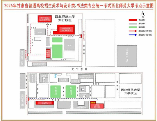 考點設在西北師范大學云亭校區(地址:蘭州市安寧區安寧東路967號)及西北師范大學知行校區(地址:蘭州市安寧區邱家灣37號)。