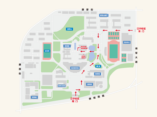 考生須從東門或南門進入,地址南京市江寧區佛城西路8號(河海大學江寧校區)。