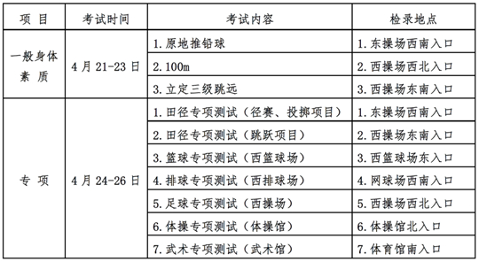(四)測試采用分組輪換、集中測試的方式進(jìn)行,4月21-23日為一般身體素質(zhì)測試,4月24-25日為專項(xiàng)測試,考生具體考試時(shí)間以《專業(yè)準(zhǔn)考證》上公布為準(zhǔn)。