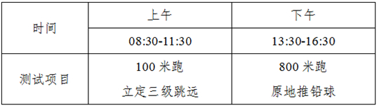 3.測試:考生到達(dá)該項目測試場地后,由裁判員宣讀測試規(guī)則及注意事項,考生按照指令依次進(jìn)行測試。體育測試所有項目均采用電子設(shè)備計時、測距,測試結(jié)果通過電子顯示屏現(xiàn)場公示?忌趨⒓芋w育測試期間應(yīng)自行做好防雨、防滑等個人準(zhǔn)備。