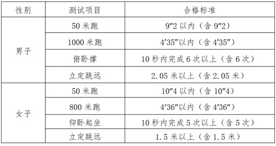 ③50米。合格標準:男性考生7秒1以內(含7秒1),女性考生8秒6以內(含8秒6)。