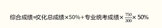 答:使用省級(jí)專業(yè)統(tǒng)考成績作為專業(yè)考試成績的藝術(shù)類專業(yè),在考生高考文化成績(含錄取照顧政策加分)、省級(jí)專業(yè)統(tǒng)考成績分別達(dá)到我省錄取控制分?jǐn)?shù)線后,根據(jù)考生綜合成績排序確定位次。綜合成績計(jì)算公式: