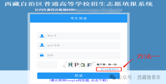 建議使用計(jì)算機(jī)和Chrome(谷歌)瀏覽器進(jìn)行網(wǎng)上志愿填報(bào),考生可通過(guò)計(jì)算機(jī)瀏覽器訪問(wèn)西藏自治區(qū)教育考試院官方網(wǎng)站(http://zsks.edu.xizang.gov.cn),依次點(diǎn)擊“高考高招”“志愿填報(bào)”后,進(jìn)入“西藏自治區(qū)普通高等學(xué)校招生志愿填報(bào)系統(tǒng)”登錄頁(yè)面?忌部赏ㄟ^(guò)在計(jì)算機(jī)瀏覽器地址欄輸入網(wǎng)址(http://ptgx.zsks.edu.xizang.gov.cn:8084)后回車,進(jìn)入“西藏自治區(qū)普通高等學(xué)校招生志愿填報(bào)系統(tǒng)”考生登錄頁(yè)面。Chrome(谷歌)瀏覽器,可在登錄界面下載。