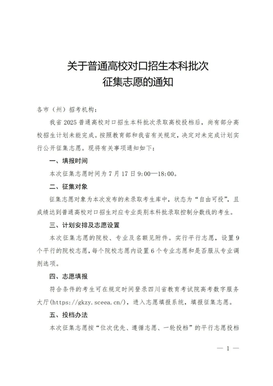 四川:關于普通高校對口招生本科批次征集志愿的通知
