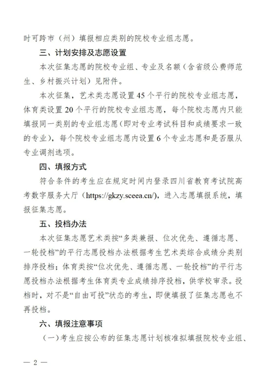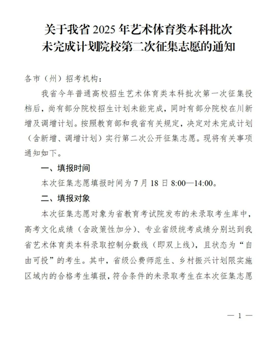 關(guān)于四川省2025年藝術(shù)體育類本科批次未完成計劃院校第二次征集志愿的通知