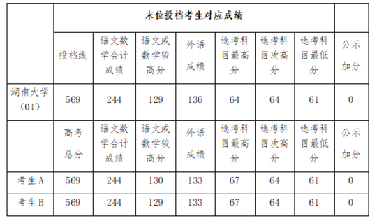 考生A的語文數學合計成績244分與湖南大學(01)末位投檔考生成績相同,語數單科較高成績130分高于湖南大學(01)末位投檔考生的129分,故考生A被成功投檔至湖南大學(01)。