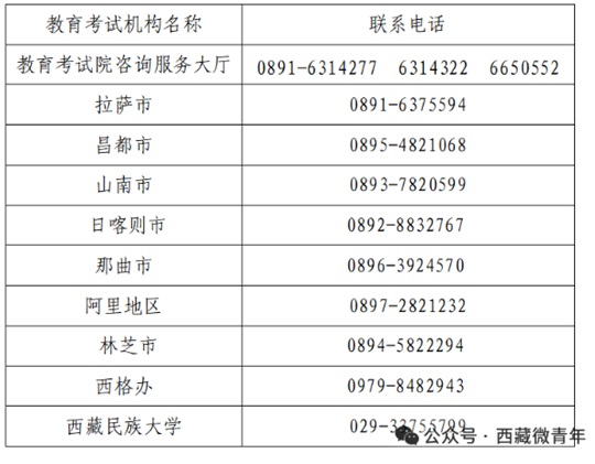 西藏自治區教育考試院咨詢服務大廳,各地市教育局考試中心、西格辦招生辦、西藏民族大學招生辦。