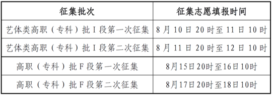 F段征集2次,普通類征集高職(專科)批最低控制分數線上未被錄取的考生。中職升學招生計劃第一次征集后,如生源不足,可按相關規定在第二次征集時適當降分,降分幅度不超過20分。