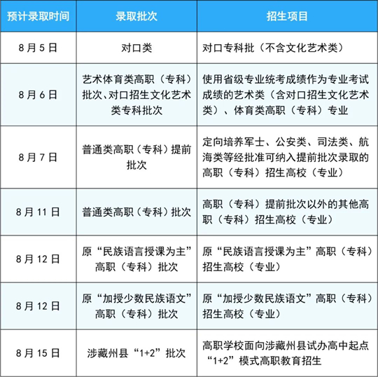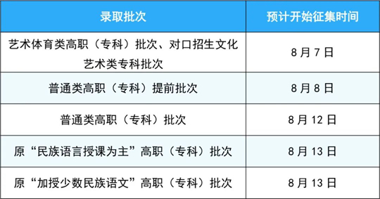 8月,高考錄取進入普通類、藝術類、體育類等多個招生類型的高職(專科)批次,各批次預計錄取時間詳見下表。