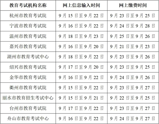 職業(yè)技能考試分理論知識(shí)和技能操作兩部分,本次報(bào)名的是技能操作考試。職業(yè)技能操作考試的報(bào)名條件等信息詳見各設(shè)區(qū)市發(fā)布的職業(yè)技能操作考試報(bào)名公告。考生可登錄浙江省教育考試院網(wǎng)站(www.zjzs.net)“考試招生”欄目或點(diǎn)擊文末“閱讀原文”查看有關(guān)公告,并按當(dāng)?shù)毓娲_定的要求報(bào)考。報(bào)名流程主要為網(wǎng)上信息輸入和網(wǎng)上繳費(fèi)兩階段,各地安排見下表。