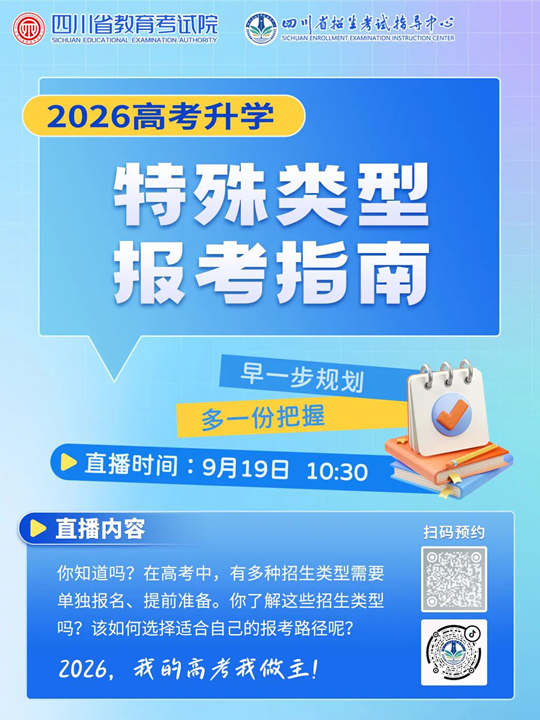 高考,承載著“為黨育人、為國選才”的重要使命,廣受社會關注。目前,空軍招飛、海軍招飛、部分綜合評價招生高校已發布2026年招生政策,為助力我省廣大考生、家長把握高考政策動態、規劃升學路徑,由四川省教育考試院指導、四川省招生考試指導中心傾力推出的“2026年高考升學特殊類型報考指南”直播活動將于本周五開播。