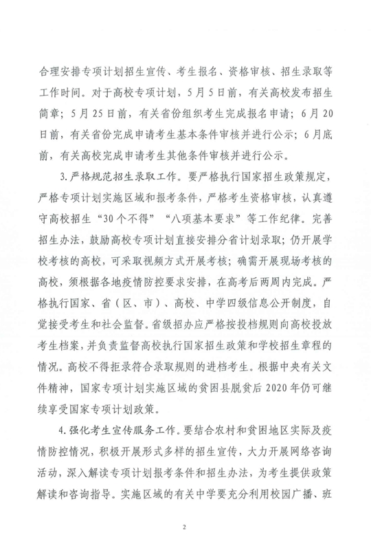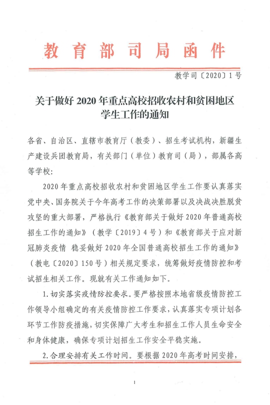 教育部辦公廳關于做好2020年重點高校招收農村和貧困地區學生工作的通知