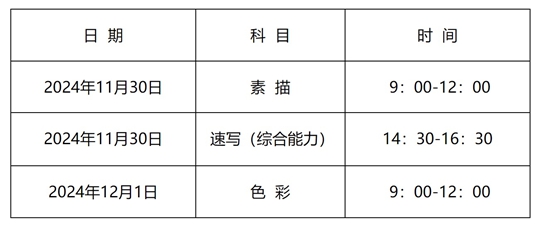 考試時間:2024年12月1日9:00-12:00。其中,書法臨摹科目考試時間為9:00-10:30,書法創作科目考試時間為10:30-12:00。