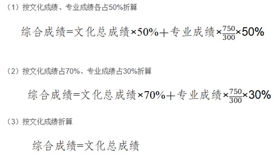 (四)使用省級統考成績招生的藝術類專業,依據考生高考文化成績和省級統考成績按比例計算后的綜合成績排序,實行平行志愿投檔。綜合成績有三種計算方式,高校在編制計劃時每一個招生專業須選定其中一種進行排序。